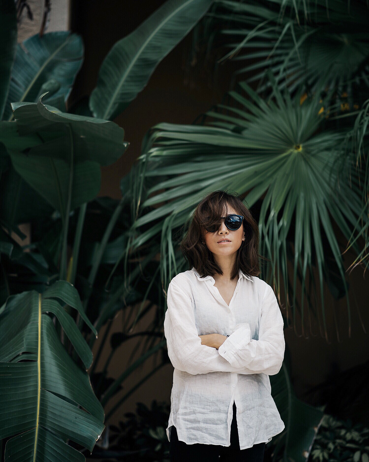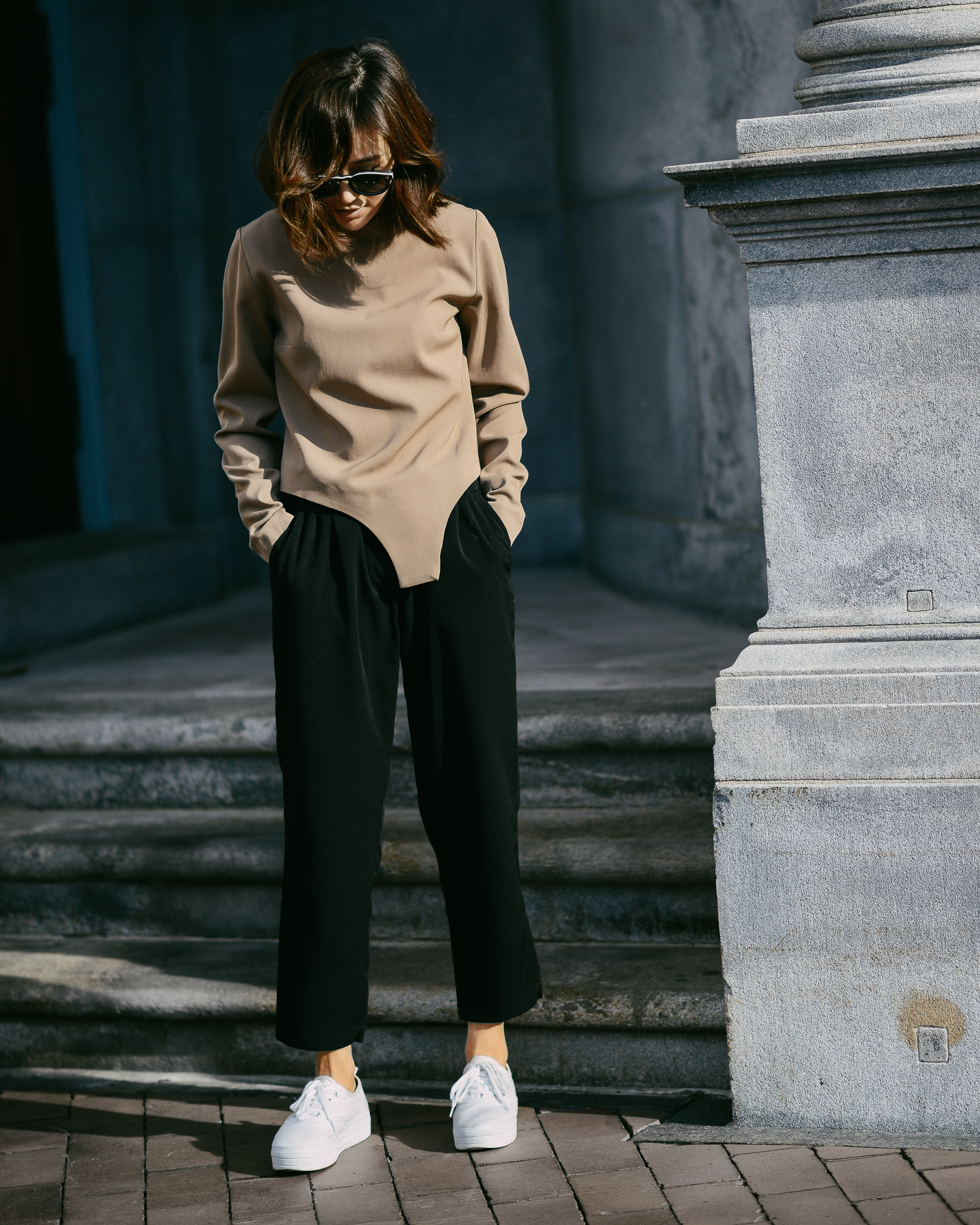 This long-line tunic is now my new favorite. The über high splits on front with the extended overall length makes the best statement. The front flap flows beautifully with every movement while the closed back maintains structure. I’m wearing the matching pants by the same label in black. The