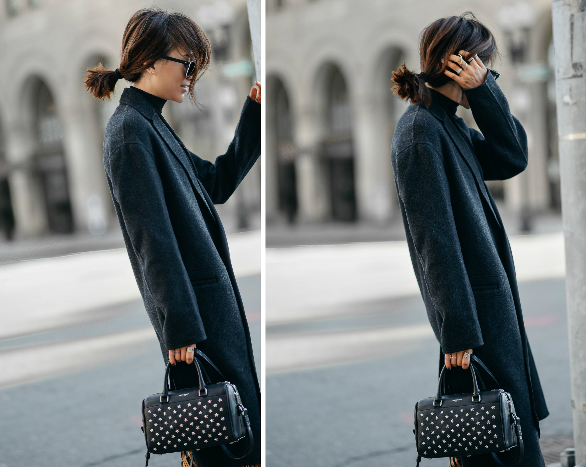VINCE. wool coat | Live a Little Faux Suede Fringe Skirt | H&M leather pants | H&M silk blouse | Zara Extra Thin Scarf | McQ by Alexander McQueen booties